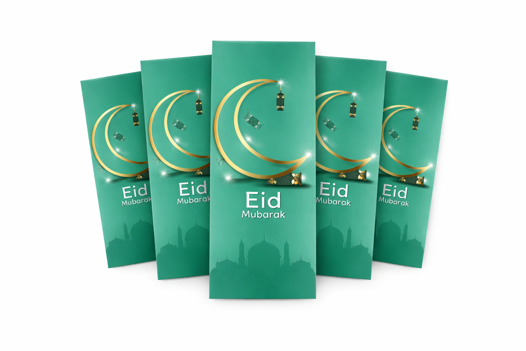 Celebrate Eid in style with this pack of 10 Eid Mubarak money envelopes, perfect for gifting Eidi cash to friends and family. Each envelope features a beautiful Islamic-inspired design with “Eid Mubarak” on the front, making your Eid gifts feel extra special. Made with quality materials and a neat wallet-style format, they’re ideal for Eid parties, family gatherings, and gifting to children and loved ones.